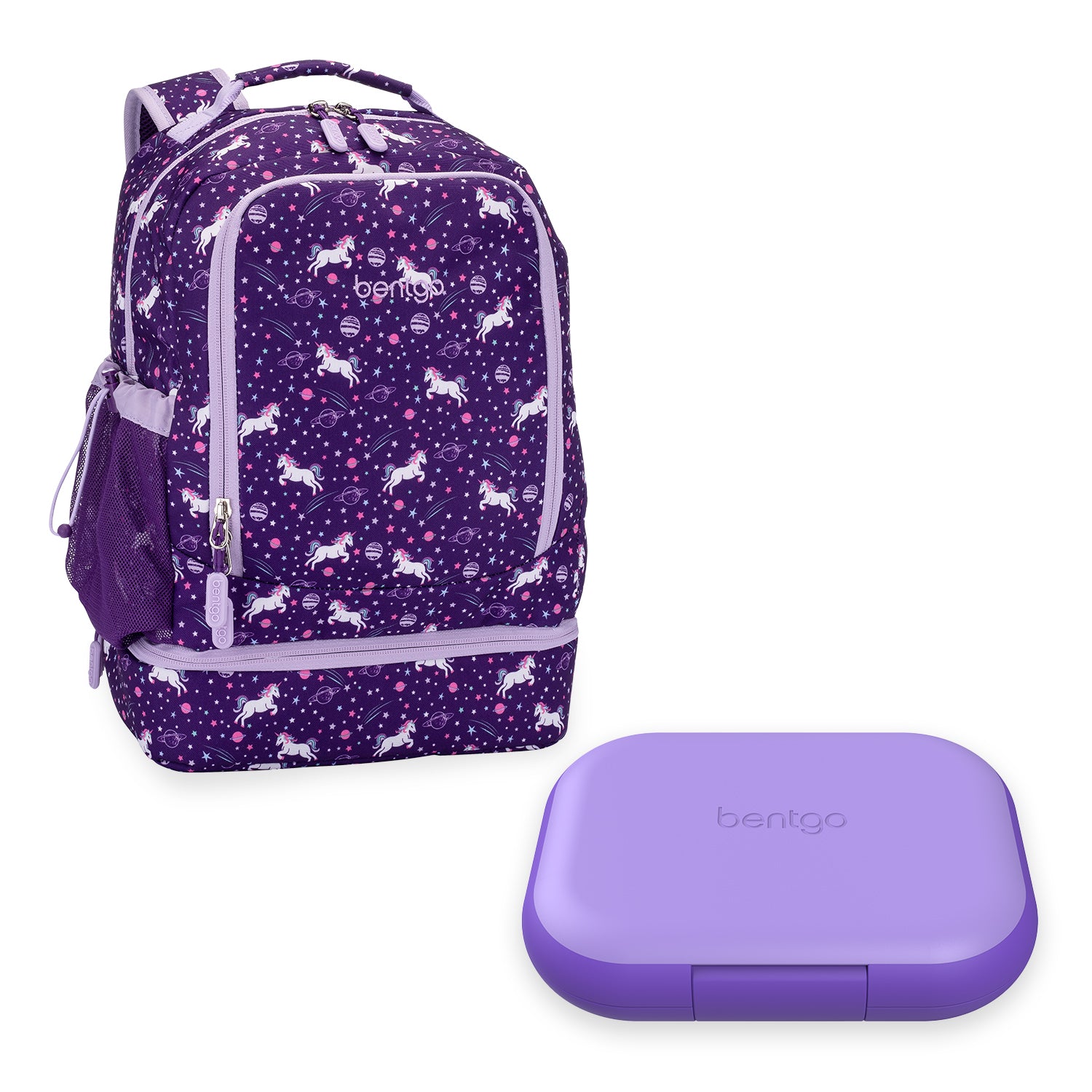 Give your child’s lunch a bit of personality with an array of fun prints and matching bright colors in this all-in-one bundle. This two-piece set comes with a Bentgo Chill Kids lunch box and a coordinating Bentgo Kids Prints 2-in-1 backpack and lunch bag. The lunch box has a bento-style. multi-compartment design that is perfectly portioned for fruits. veggies. dips. an entr??e. and dessert. Plus. it keeps their lunch cool with a built-in ice pack underneath the removable tray. It features a durable. leak-proof outer shell and an airtight seal that contours nicely to each compartment. so there’s no spilling in their new backpack. Speaking of the Bentgo backpack. the 2-in-1 design has a built-in. insulated lunch bag so it’s ready to hold the healthiest treats in their lunch box! Two large roomy compartments are perfect for school supplies. while the padded back and straps ensure your little one has all the support they need.?