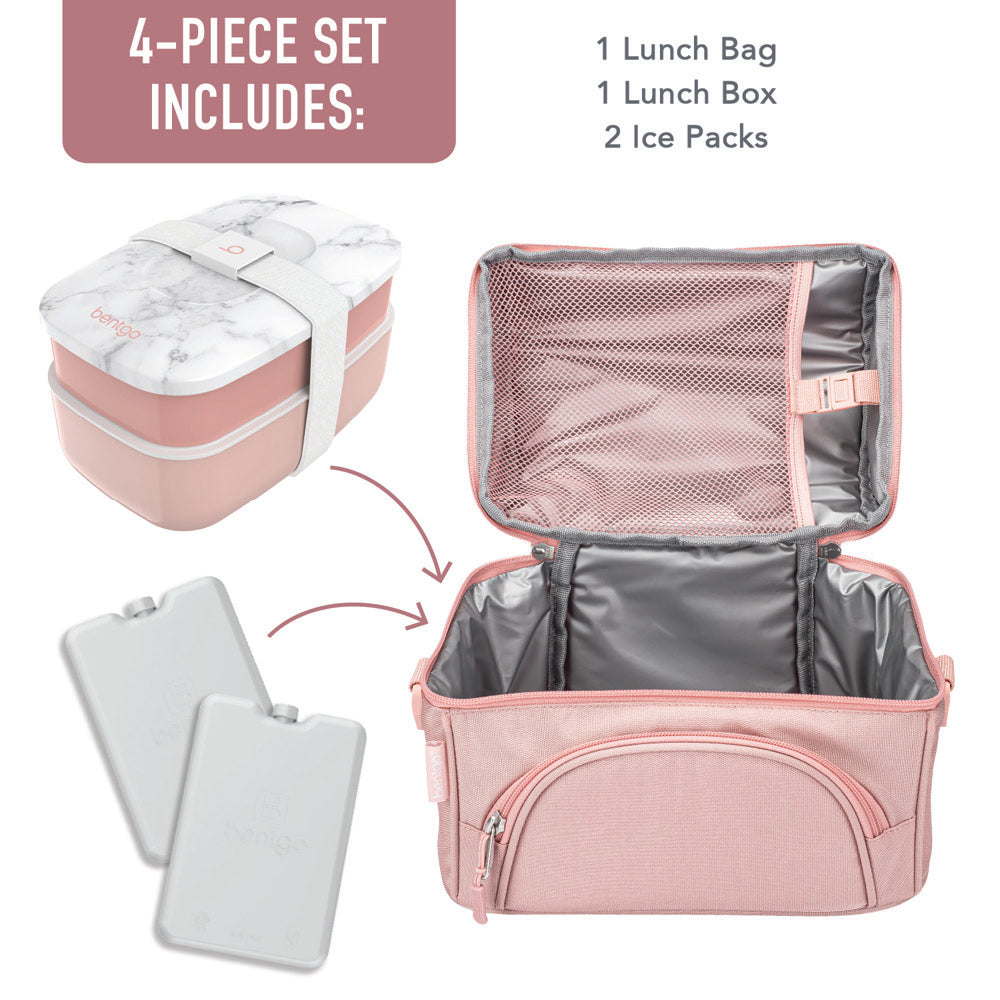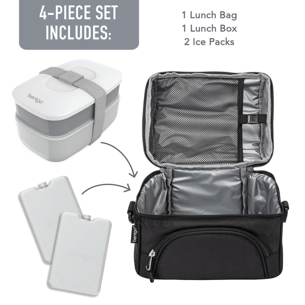 - Bentgo? Deluxe Lunch Set includes everything you need for meals on the go ?C 1 insulated lunch bag. 1 stackable lunch box with a built-in utensil set. and 2 ice packs.?