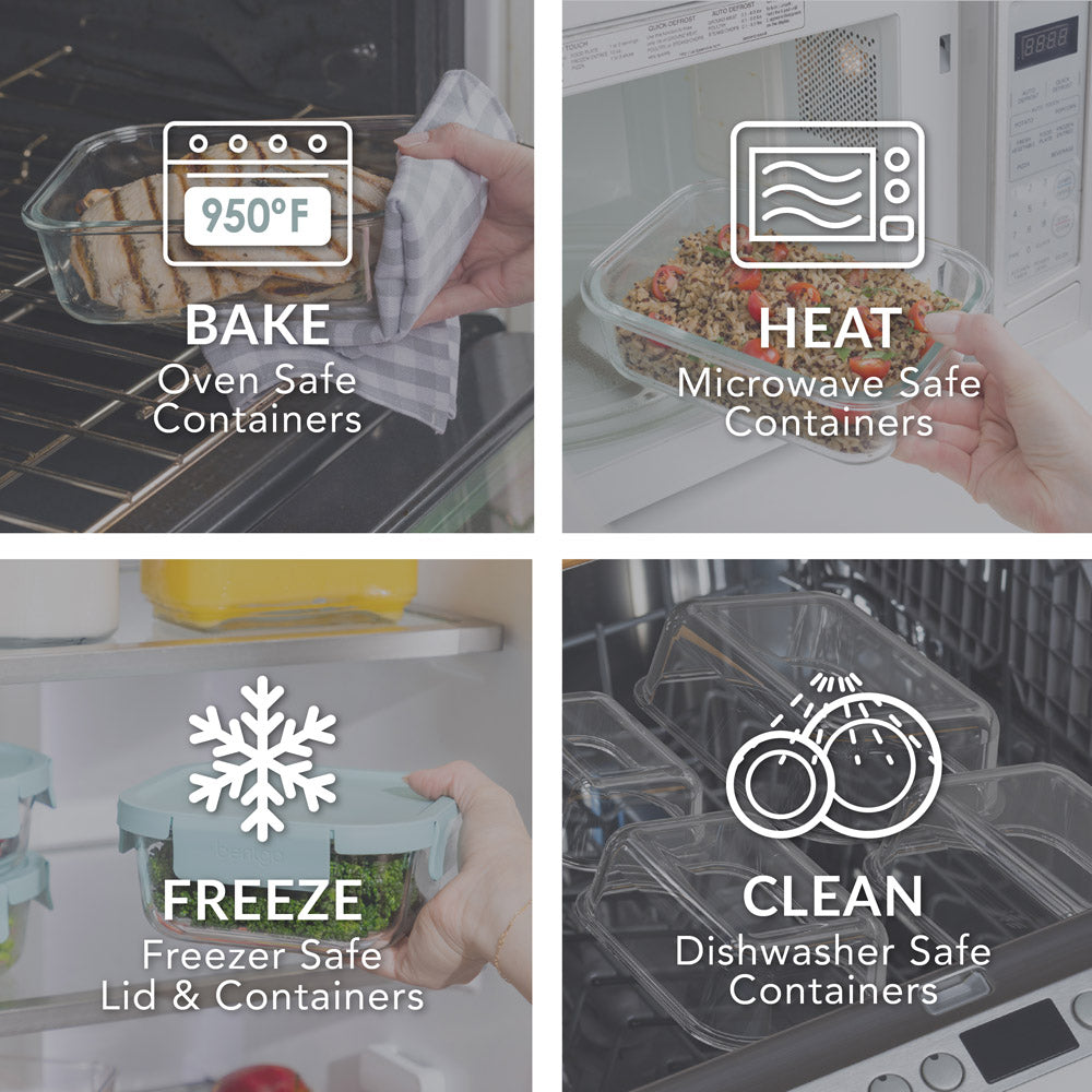 Pack and store food to enjoy later with the Bentgo? 8-Piece Leak-Proof Glass Food Storage Set! This versatile glass set keeps meals and snacks neatly organized and fresh for when you’re ready to eat. Made from high-quality borosilicate glass. this durable and reusable container offers long-lasting performance and can be used to reheat food in the microwave or oven. Plus. the durable plastic lids to easily store them in the fridge or freezer! It’s great for storing everything ?C from leftover meals to soups and broths. veggies and fruits. proteins. and more. Its functional. 100% airtight locks seal lids in freshness and prevent inconvenient leaks so you can enjoy healthy meals at school. work. or wherever your day takes you.