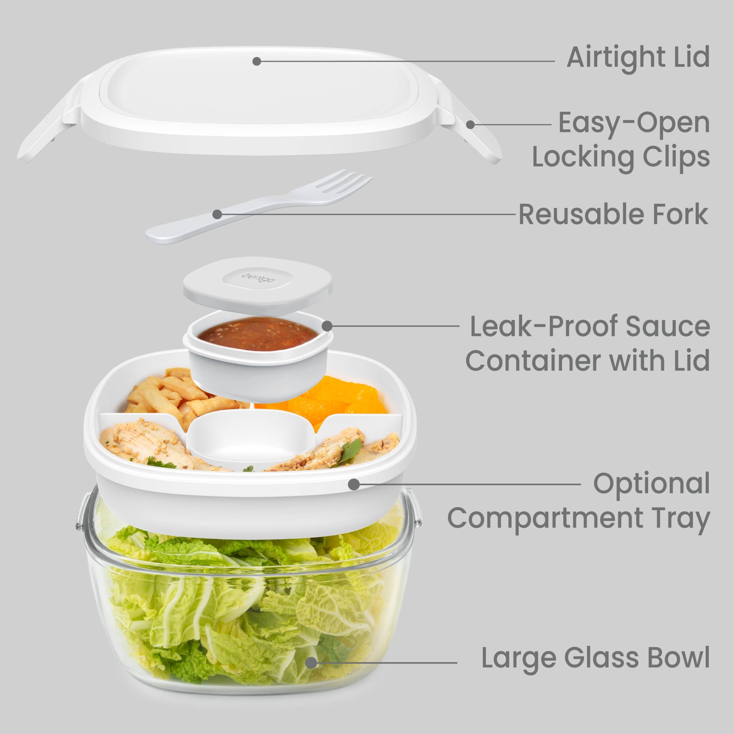 - Store Everything Separately: Keep salads fresh and toppings separated with a removable tray that nests in the bowl. The 4-compartment tray has a large 8.9-oz compartment & two small 4.2-oz compartments. plus a leak-proof 3-oz container & a reusable fork!