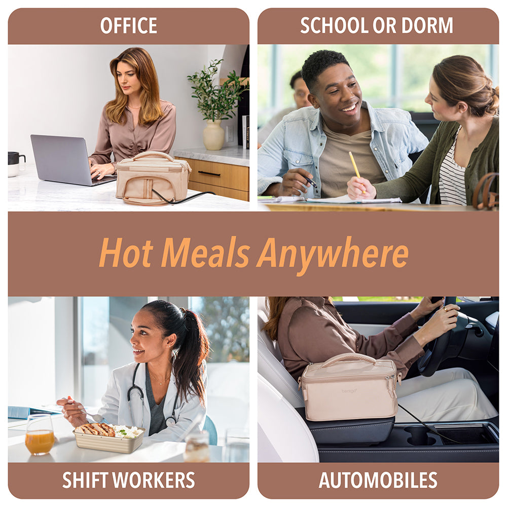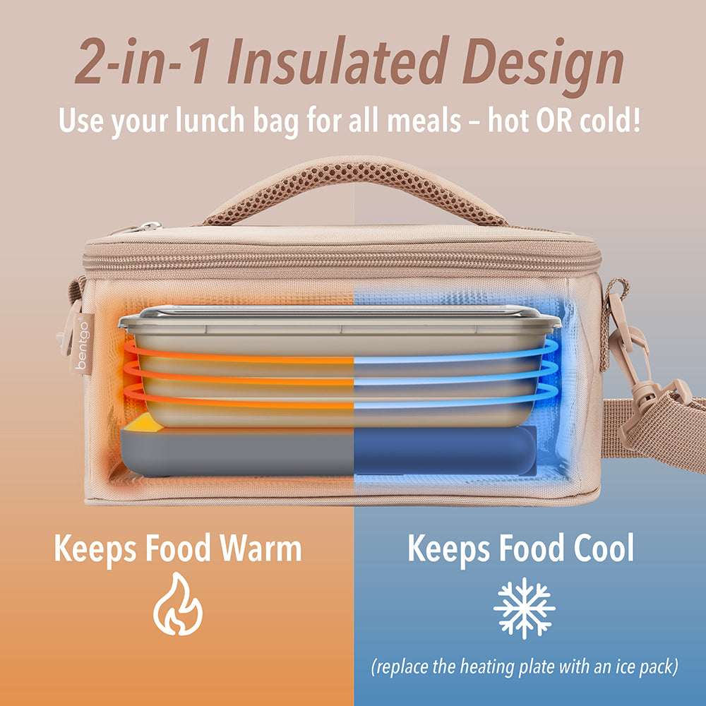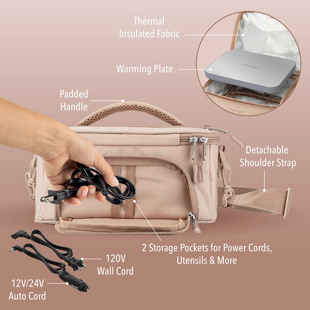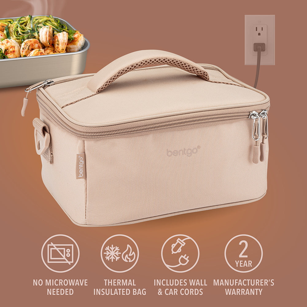 Cold meals are a thing of the past with the Bentgo Heat Electric Lunch Bag. This sleek and compact bag warms your food to perfection. ensuring every bite is as delicious as if freshly prepared. Simply place your sealed food container on the warming plate inside your Bentgo Heat lunch bag. zip it up. plug it in. and warm your food for 45 minutes or more. From leftovers to frozen meals. your Bentgo Heat Electric Lunch Bag is conveniently fast-heating. easy to use. and the perfect microwave alternative for the office. school. shift workers. camping. and on-the-go. Included is a 120V AC wall power cord and a 12V/24V DC car power cord so you can heat your meals wherever. whenever!
