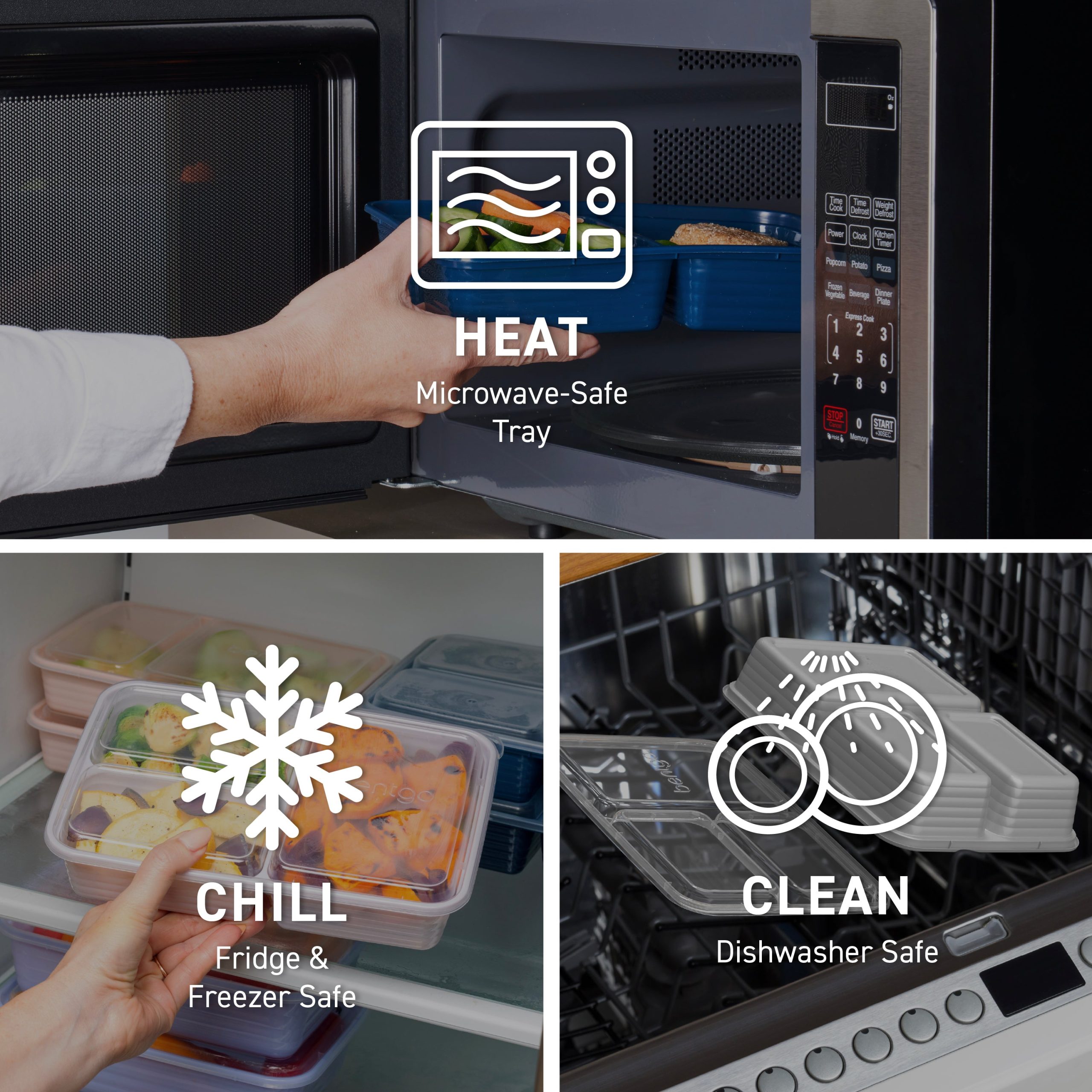 - Microwave. Freezer & Dishwasher Safe: Easy to heat. store. and clean! Safely reheat food from fridge or freezer??microwave trays only. Top-shelf dishwasher safe for hassle-free cleanup; hand-wash lids for best results.