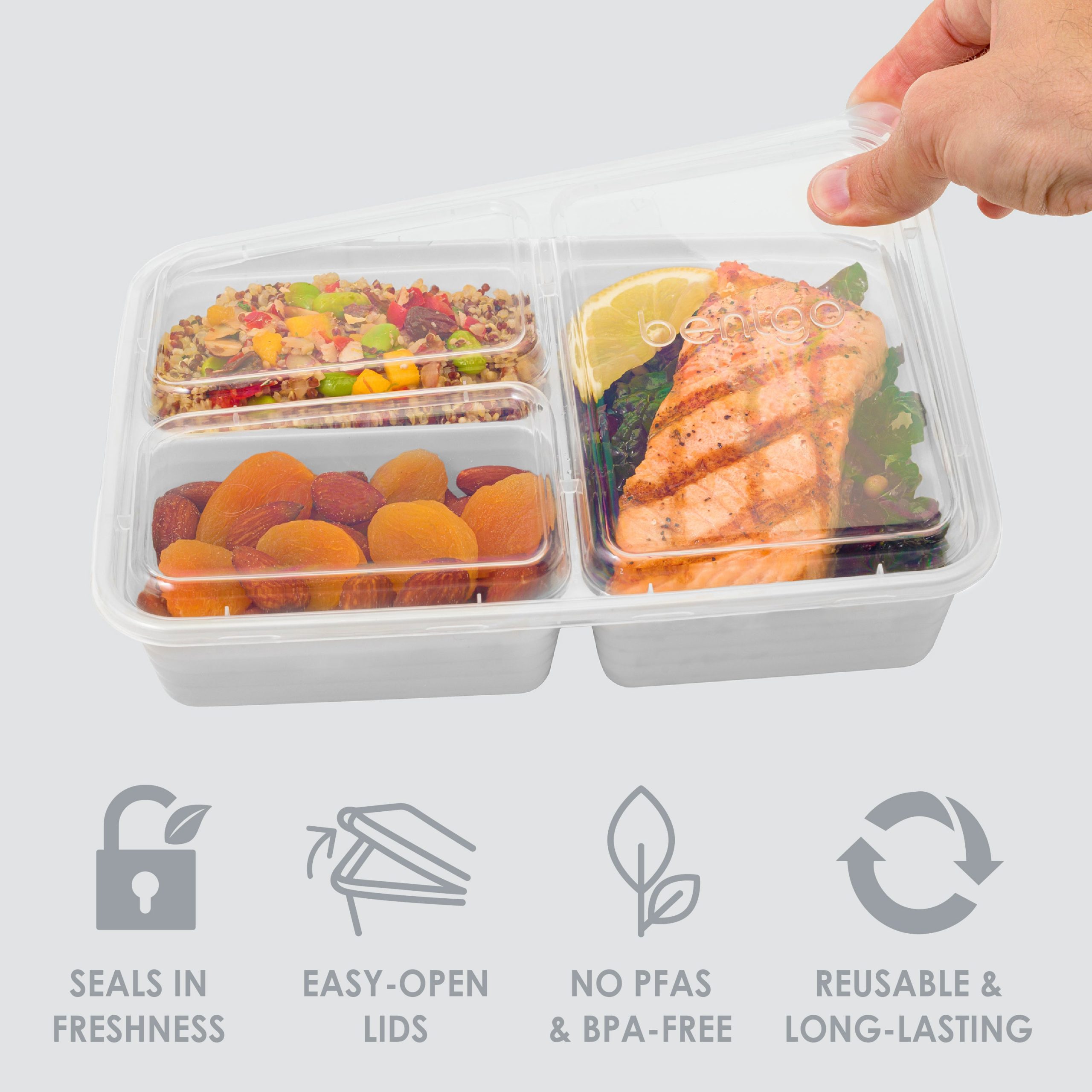 - Durable & Reusable: Made from tough. PFAS- and BPA-free materials. these meal prep containers are built to last through repeated use. Say goodbye to single-use plastics with these reusable containers you can take to work. school. or the gym.
