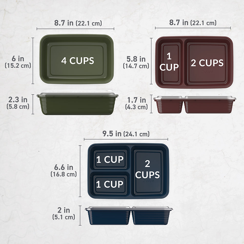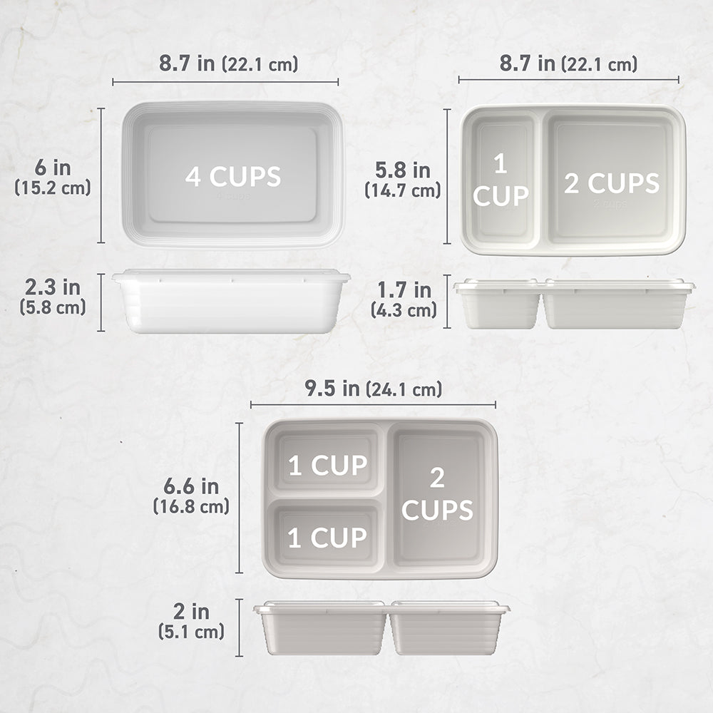 - Portion-Controlled Design: No need to measure your portions??volume is already embossed on the tray. The custom-fit lids keep food fresh all day long and stack together neatly to save you space in your pantry.