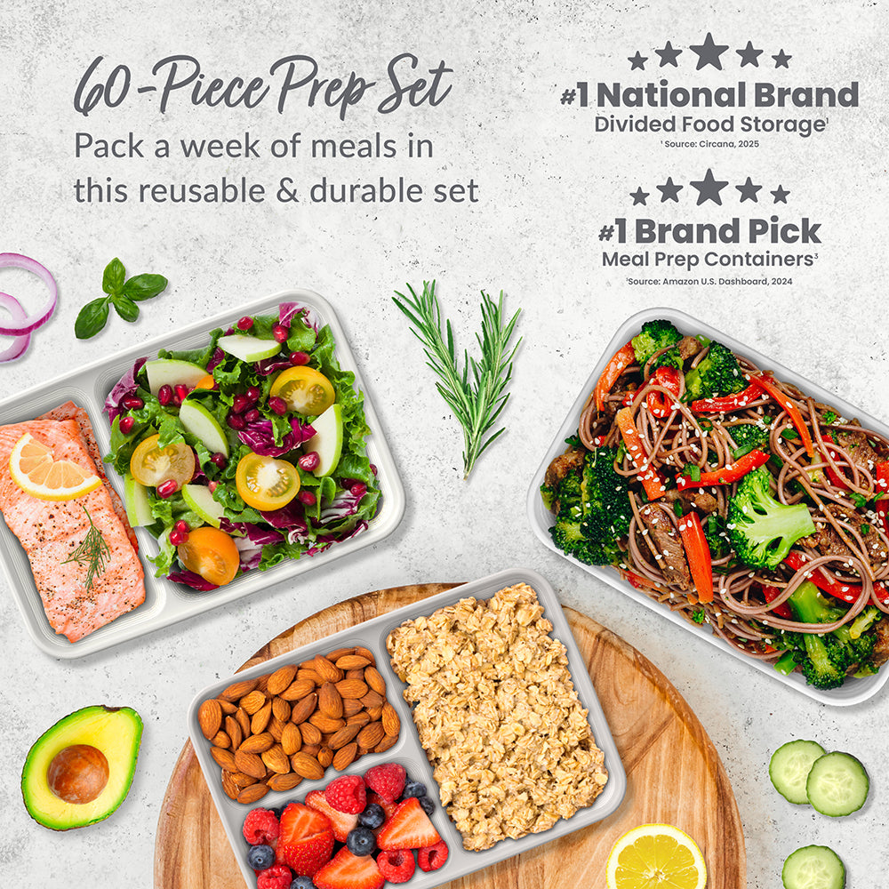 - #1 Brand Pick for Meal Prep Containers: Bentgo is the top pick for meal prep containers!* Get everything you need for meal prepping in one convenient set! This durable and reusable 60-piece meal prep mix comes with 10 one-compartment trays. 10 two-compartment trays. and 10 three-compartment trays??all with their own fitted lids. Make breakfast. lunch. and dinner for the entire week or for multiple members of your family with this complete set.